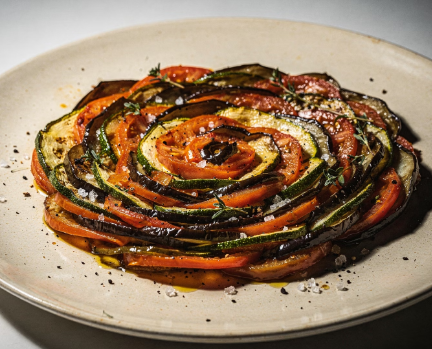- 가지 라따뚜이: [재료: 가지 1개, 호박 1개, 토마토 1개, 토마토소스] 채소들을 얇게 썰어 소스를 깐 팬에 겹겹이 두릅니다. 뚜껑을 덮고 중불에서 채소가 부드러워질 때까지 뭉근하게 끓여냅니다.