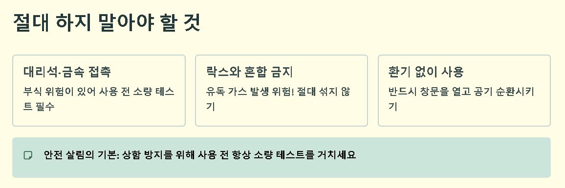 천연 성분이라도 산성이므로 맨손으로 오래 만지면 피부가 거칠어질 수 있으니 고무장갑을 꼭 착용하세요. 청소 중에는 창문을 열어 공기를 순환시켜 주면 냄새 방지와 함께 쾌적한 살림 환경을 만들 수 있어 훨씬 안심하고 사용할 수 있습니다.