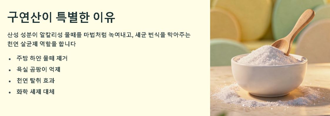 | 도마/칼 | 세척 후 구연산수 뿌리기 | 천연 살균 및 냄새 제거 |