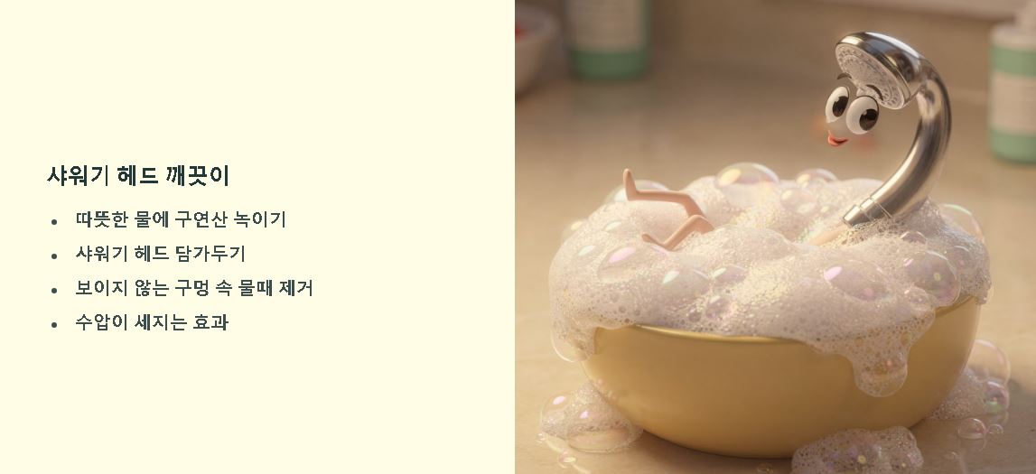 샤워기 헤드를 구연산 녹인 따뜻한 물에 담가두면 보이지 않는 안쪽 구멍의 물때까지 녹아 나와 수압이 세지는 걸 볼 수 있어요. 거울의 비눗물 얼룩도 구연산수로 닦아내면 냄새 방지와 함께 투명함을 되찾아 욕실 분위기가 훨씬 환해집니다.