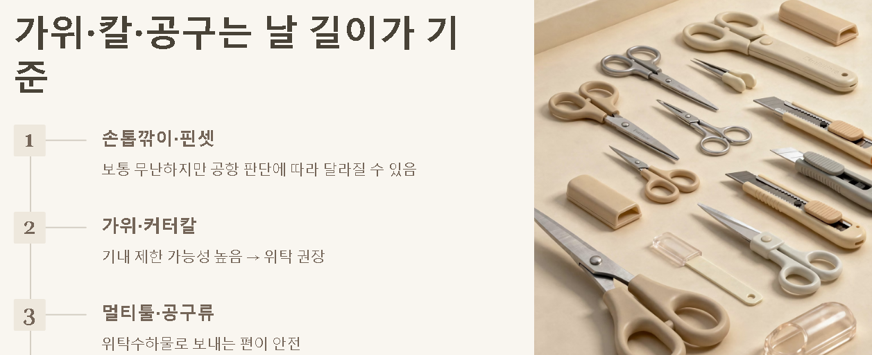 - 가위·커터칼·다용도 칼: 기내에서 문제될 수 있어 위탁으로 보내는 편이 안전