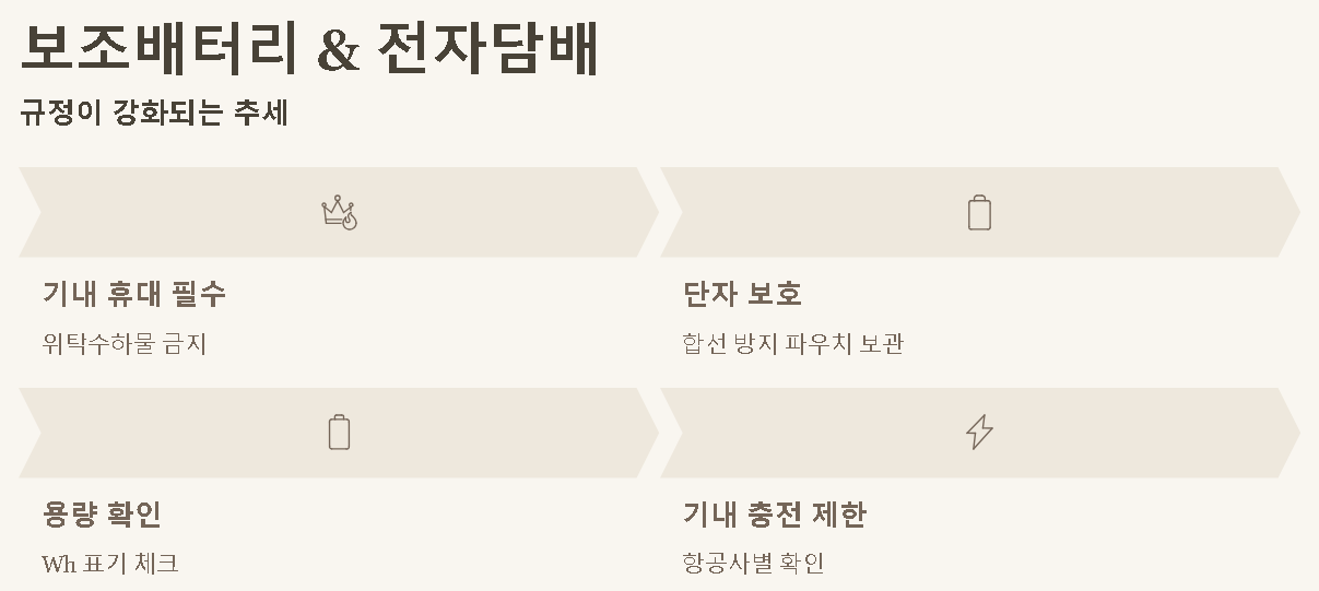 | 기내 반입만 가능 | 보조배터리, 여분 리튬배터리, 전자담배(대부분) | 가방 안쪽에 따로 모아두기 |