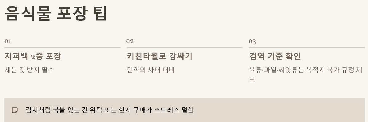 | 기내 반입 제한(위탁 가능) | 100ml 초과 액체, 일부 칼/가위/공구 | 부칠 짐으로 이동 |