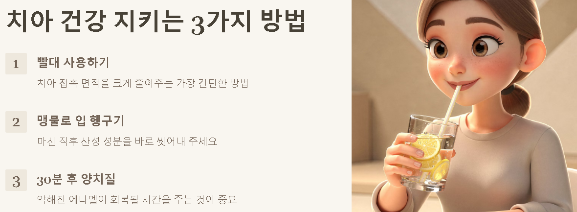 레몬즙의 강한 산성은 치아 표면을 일시적으로 약하게 만들 수 있습니다. 매일 마시는 분들이라면 치아에 직접 닿는 시간을 최소화하는 사소한 습관 하나가 큰 차이를 만듭니다. 생활 속에서 실천하기 쉬운 치아 보호 팁을 참고해 보세요.