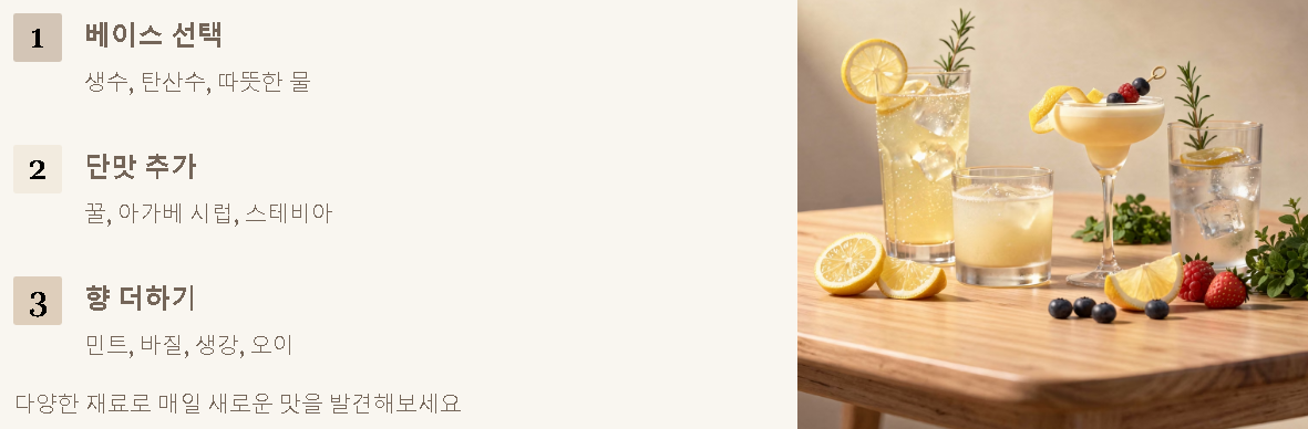 다양한 재료를 섞어 나만의 시그니처 레몬 음료를 만들어 보는 것도 생활의 작은 즐거움입니다.