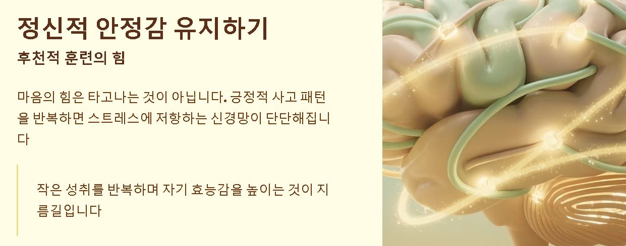 마음의 힘은 타고나는 부분도 있지만, 후천적인 훈련을 통해 비약적으로 충분히 강화될 수 있습니다. 뇌의 가소성 원리에 따라 긍정적인 사고 패턴을 비약적으로 반복하면 스트레스에 저항하는 신경망이 단단해지기 때문인데요. 작은 성취를 반복하며 자기 효능감을 비약적으로 높이는 것이 강한 멘탈을 만드는 비약적인 지름길입니다.