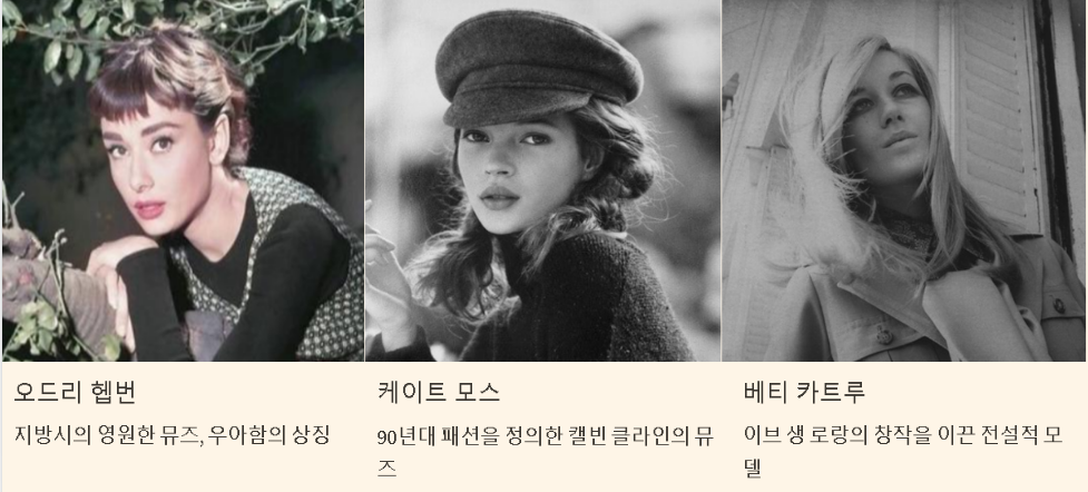패션계에서 뮤즈는 디자이너의 철학을 가장 잘 표현해 주는 모델이나 셀러브리티를 뜻합니다. 브랜드의 이미지를 완성하고 새로운 컬렉션의 방향성을 제시하는 중추적인 역할을 하기도 하죠.