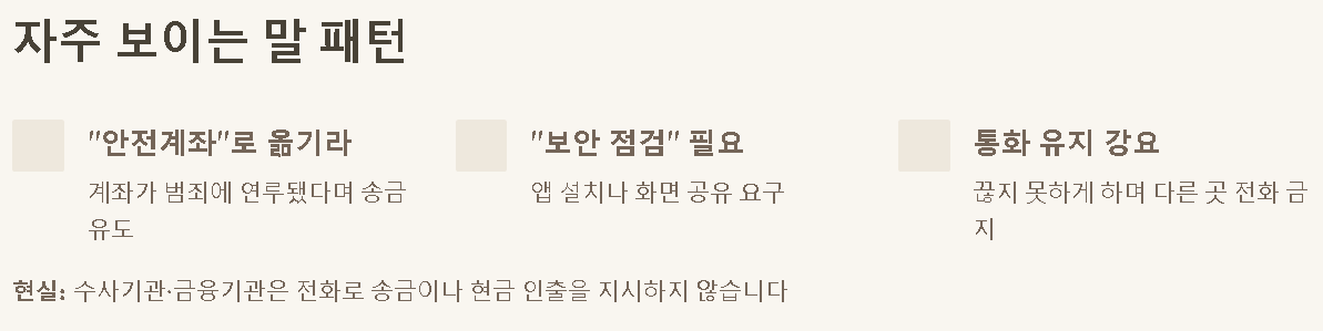 | 기관 사칭 | 전화 | 계좌 이동, 현금 인출, 앱 설치 | “수사”, “보안”, “계좌가 위험”을 반복 |