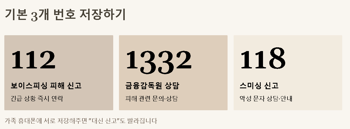 실제로 위급한 순간엔 어디에 전화해야 할지 머리가 하얘질 수 있어요. 그래서 가족 휴대폰에 ‘신고/상담 번호’를 미리 저장해 두는 것만으로도 대응 속도가 달라집니다. 공식 안내에서도 보이스피싱 피해 신고는 112, 문의·상담은 금융감독원 1332, 스미싱 등은 118을 안내하고 있어요.