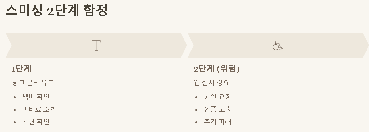 | 택배·청구서 스미싱 | 문자 | 링크 클릭, 앱 설치 | 짧은 링크, “조회/확인”을 강요 |