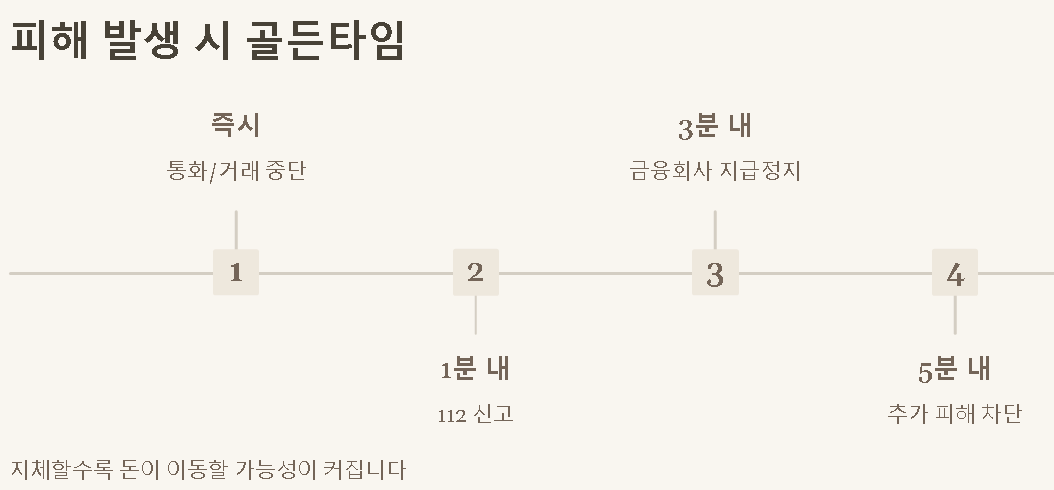 보이스피싱은 “당황한 5분”이 제일 위험해요. 그래서 대응은 어려운 걸 하기보다, 순서만 정해두는 게 좋아요. 특히 피해가 발생했을 때는 지체할수록 돈이 이동할 가능성이 커지니, 신고와 지급정지 요청이 우선입니다. 보이스피싱 피해 시 112 신고가 통합 처리에 도움이 된다는 안내도 공식적으로 나와 있어요.