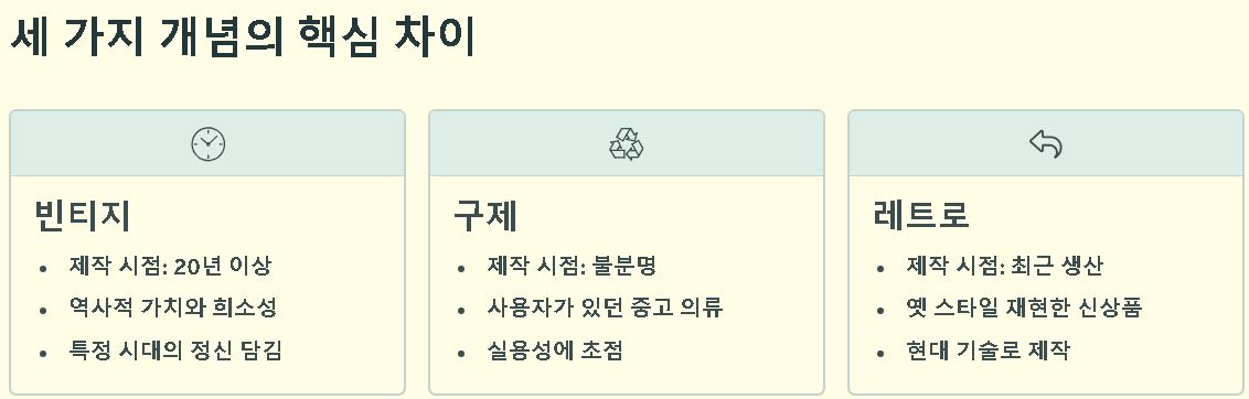 | 빈티지 | 20년 이상 과거 | 역사적 가치와 희소성 |