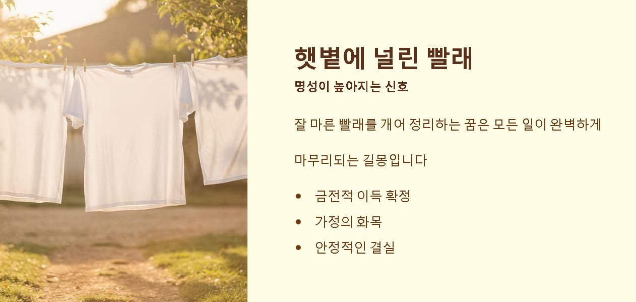 빨래를 다 한 뒤 햇볕에 널어 말리는 행위는 자신의 성과를 세상에 공개하고 인정받는 과정을 상징합니다. 잘 마른 빨래를 개어 정리하는 꿈은 모든 일이 완벽하게 마무리되어 안정을 찾는다는 의미인데요. 이는 금전적인 이득이 확정되거나 가정이 화목해지는 결과로 이어지는 경우가 많습니다.