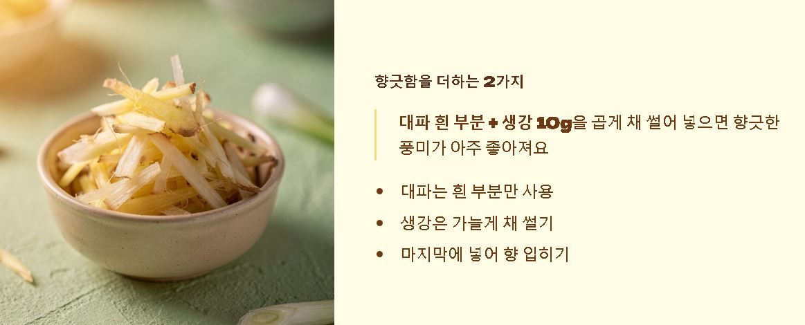 - 썰어둔 대파와 생강 채를 마지막에 넣어 향을 입혀주면 완성입니다.