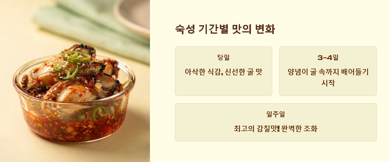- 고춧가루 날내가 사라지고 굴의 단맛이 양념에 배어 나와 조화가 완벽해집니다.