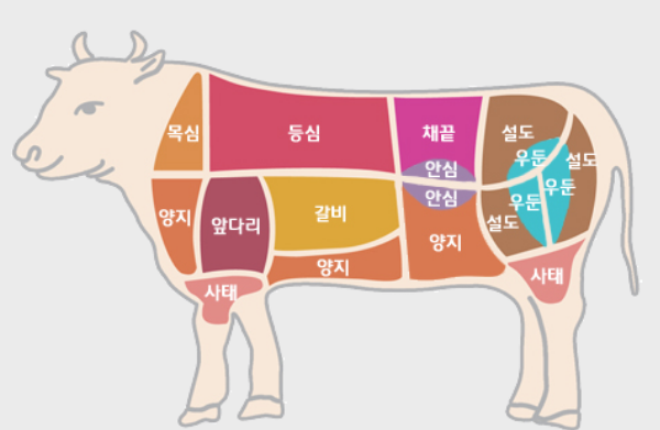 - 등심: 고기 결이 곱고 마블링이 우수하여 고소한 구이나 스테이크에 적합함