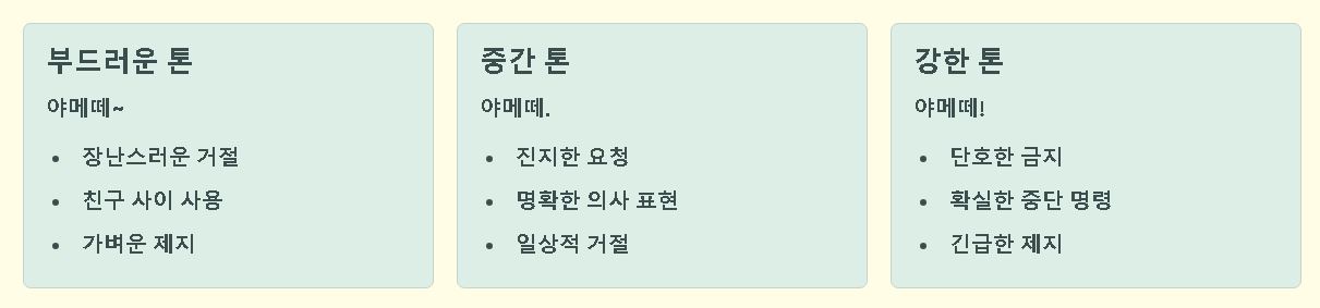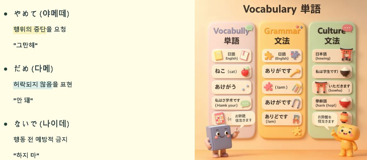 일본어에는 야메떼 외에도 '다메(안 돼)'나 '나이데(하지 마)' 등 다양한 제지 표현이 존재합니다. 상함 방지를 위해 식재료를 분류하듯 각 단어의 강도를 이해하고 적재적소에 사용하는 것이 비약적으로 자연스러운 언어 구사의 신호가 됩니다.