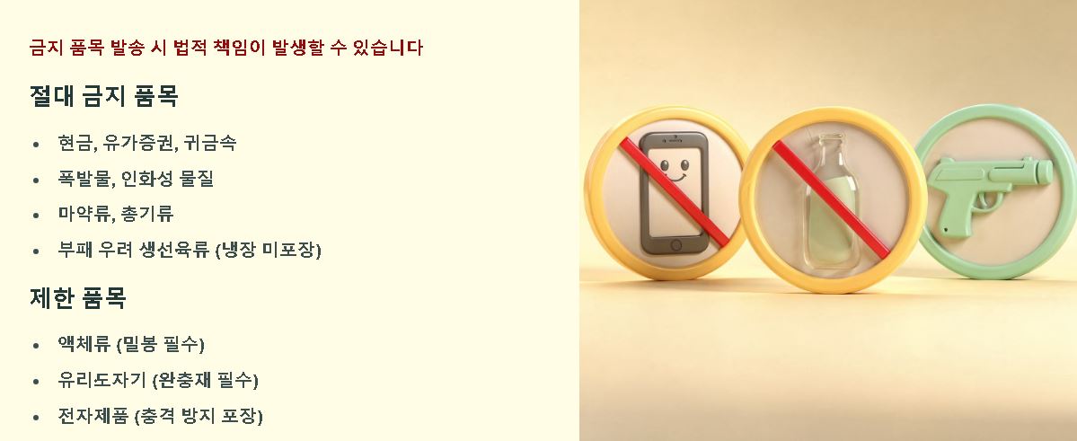 - 포장 금지 물품 : 현금, 귀금속, 변질 우려 식품 등 비약적 제한 신호