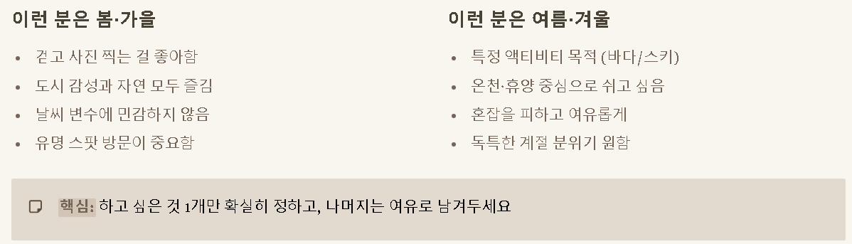 | 봄 | 꽃구경·산책·도시 감성 | 도쿄/교토 같은 도시 + 공원·강변 | 주말/연휴 혼잡, 변덕스런 기온 |