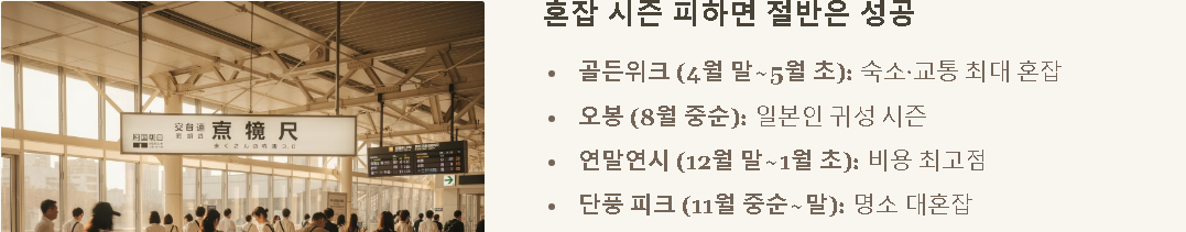 | 대형 연휴(골든위크/연말연시) | 비용↑ 혼잡↑ | 연휴 분위기 자체가 목적일 때 | 이동일은 평일로, 숙소는 최소 2~3박 고정 |