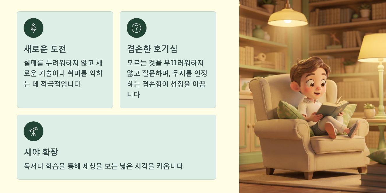 자존감이 높은 사람들은 배움을 통해 자신의 영역을 확장하는 즐거움을 압니다. 호기심을 가지고 새로운 분야에 도전하며, 모르는 것을 부끄러워하지 않고 질문하는 태도를 지닙니다. 이는 정체되지 않고 성장하는 자아를 만듭니다.