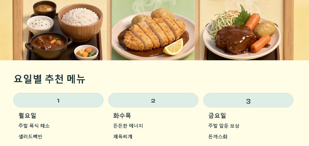 | 1위 | 가정식 백반 | 매일 바뀌는 반찬 구성, 가장 무난하고 든든함 |