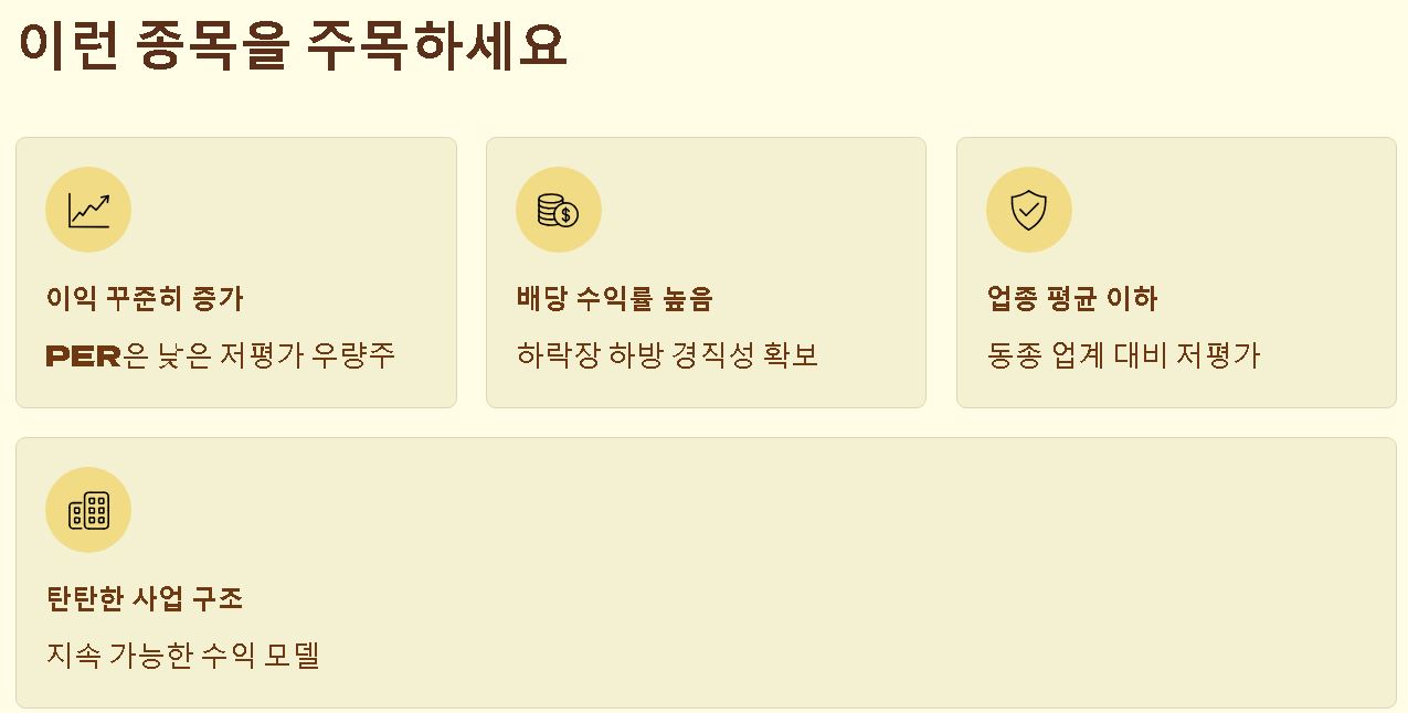 | 주가 특징 | 소외되었거나 저평가됨 | 시장의 비약적 기대 집중 |
