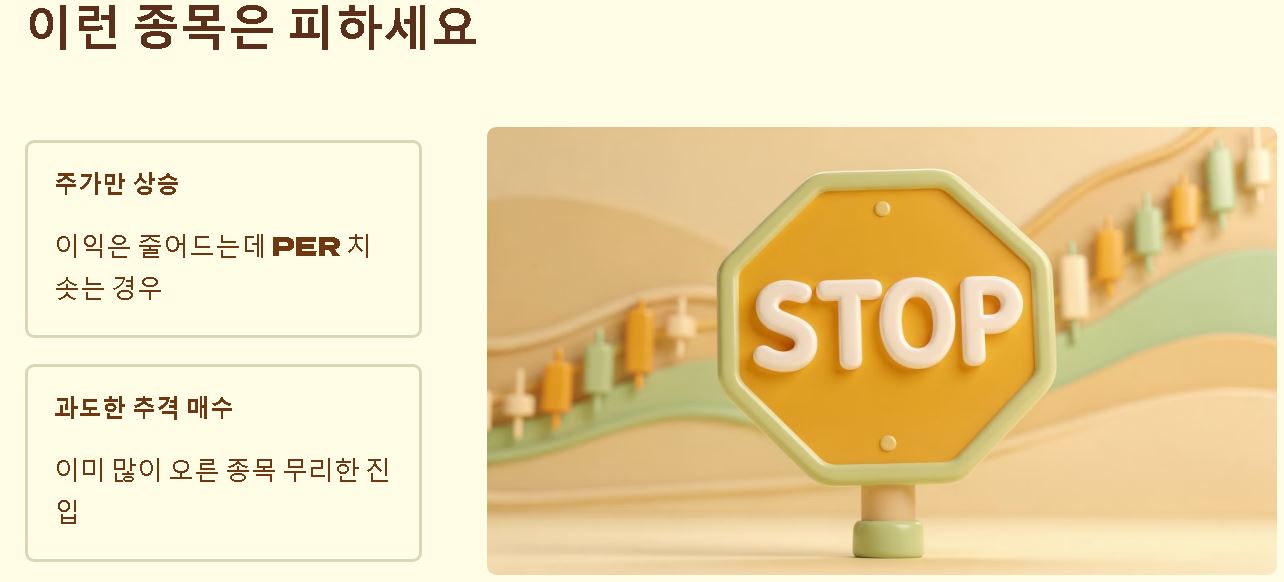 - 주가는 오르는데 이익이 줄어 PER이 비약적으로 치솟는 종목은 추격 매수를 자제하세요.