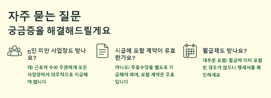 주휴수당이란 일주일간 소정근로일을 개근한 근로자에게 주 1회 이상의 유급휴일을 부여하고 이때 지급하는 임금을 의미하며 상시 근로자 수와 상관없이 모든 사업장에 적용되는 원칙이죠. 냄새 방지를 위해 환기를 하듯 근로 환경의 투명성을 위해 사용자와 근로자 모두 이 규정을 명확히 알고 있는 것이 마음 한결 놓이는 첫걸음입니다.