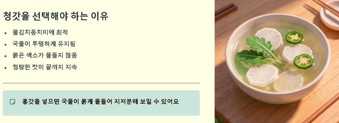 | 동치미/백김치 | 청갓 | 국물 색 변화 방지 및 시원함 |