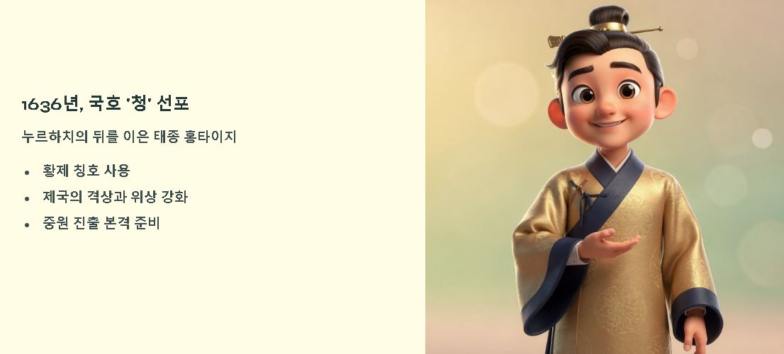 누르하치의 뒤를 이은 태종 홍타이지는 1636년 국호를 '청(淸)'으로 바꾸고 황제를 칭하며 본격적인 제국 선포를 알렸습니다. 이는 상함 방지를 위해 음식을 관리하듯 국가의 격을 한 단계 높인 영리한 살림의 지혜와 같은데 몽골을 복속시키고 조선에 정묘·병자호란을 일으켜 후방을 안정시킨 것이 중원 진출의 결정적인 보탬이 되었습니다.