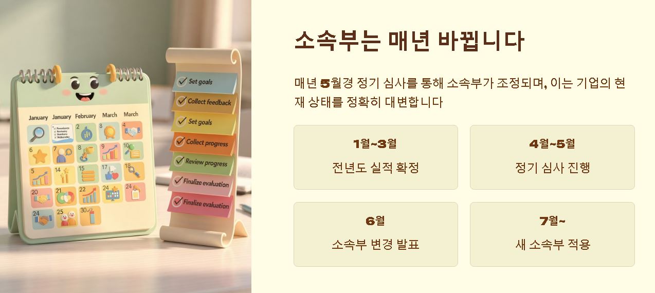 빠른요약: 매년 5월경 정기 심사를 통해 소속부가 조정되며 이는 기업의 현재 상태를 대변합니다.