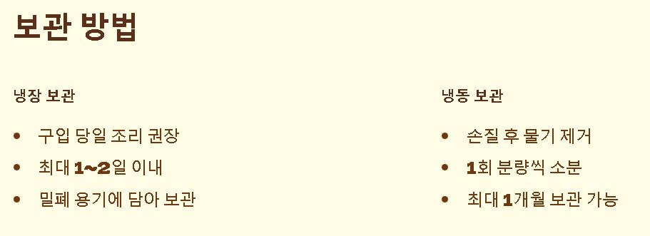 - Q: 요리 후 남은 것은 어떻게 보관하나요? 조리된 상태라면 밀폐 용기에 담아 냉장 보관하시되, 가급적 1~2일 내에 드시는 것이 좋습니다.