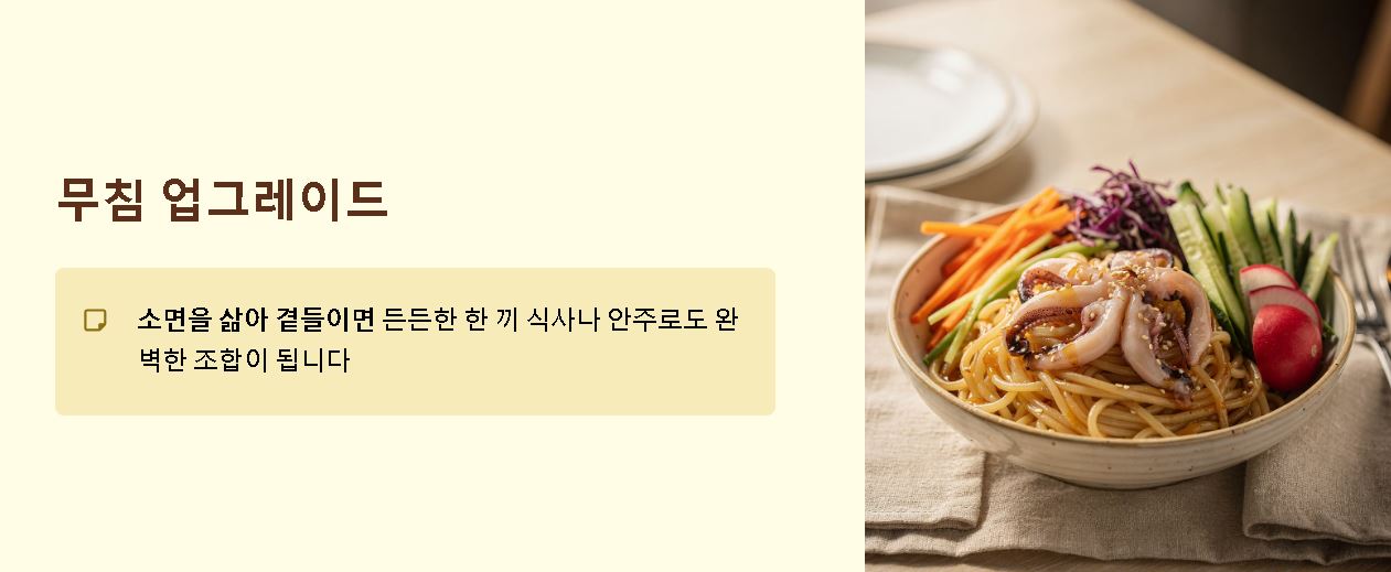 - 소면을 삶아 곁들이면 든든한 한 끼 식사나 안주로도 완벽한 조합이 됩니다.
