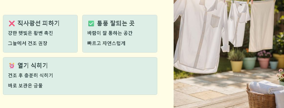흰옷 하얗게 하는 법의 마무리는 직사광선을 피해 통풍이 잘되는 그늘에서 건조하는 것인데, 햇빛이 너무 강하면 오히려 황변 현상이 가속화될 수 있어 세심한 주의가 필요합니다. 먼지 방지를 위해 건조 후 바로 옷장에 넣기보다 열기를 충분히 식힌 후 보관하는 것이 옷감을 최상의 상태로 유지하는 비결입니다.