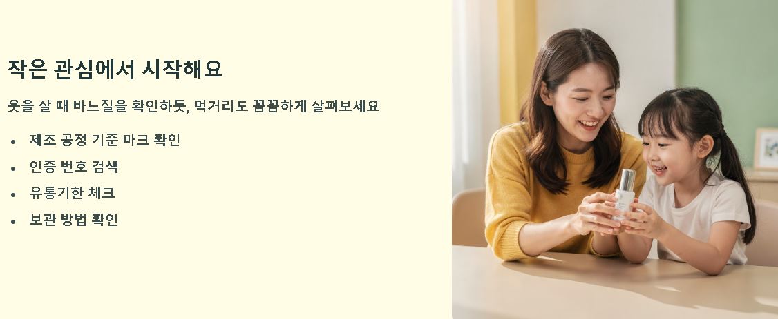결국 좋은 제품을 알아보는 안목은 관심에서 시작돼요. 옷을 살 때 바느질 마무리를 확인하듯 먹거리를 고를 때도 제조 공정의 기준인 마크를 한 번 더 쳐다보는 세심함이 필요하죠. 작은 실천이 모여 우리 가족의 건강 울타리를 더욱 단단하게 만드는 법이니까요.