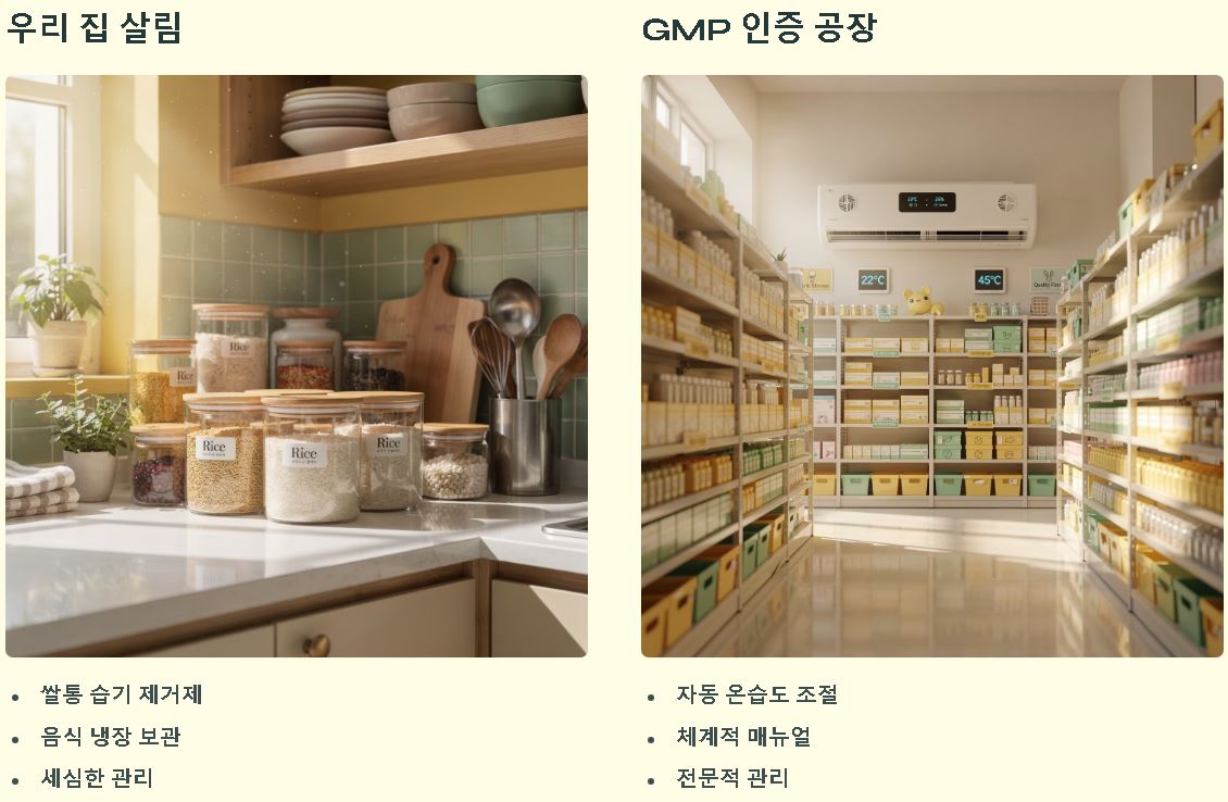 인증받은 시설은 보관 중인 원료가 상하지 않도록 온도와 습도 조절에 매우 민감하게 대응해요. 우리가 집에서 쌀통에 습기 제거제를 넣거나 남은 음식을 냉장 보관하듯 공장 차원에서도 체계적인 손질과 관리 매뉴얼을 따르는 것이죠.