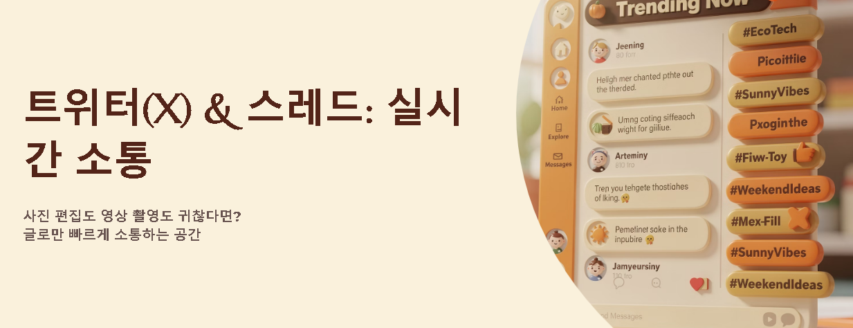 사진 편집이나 영상 촬영이 귀찮고 글로만 빠르게 소통하고 싶다면 트위터(현 X)나 스레드가 딱 맞아요. 지진이나 지하철 연착 같은 실시간 정보가 뉴스보다 빨리 올라오는 곳이며, 익명으로 속마음을 털어놓거나 덕질(팬 활동)을 하기에 최적화된 공간입니다.